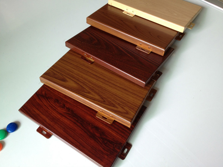 木紋鋁單板采用優質高強度合金鋁板,國際先進新型圖紋裝飾材料,圖案高檔華麗、色澤紋理逼真、圖紋牢固耐磨,不含甲醛、無毒、無有害氣體釋放,使您不必再為裝飾后油漆和膠類物質帶來的異