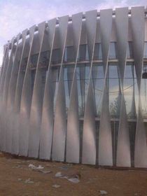 由于其加工難度大,能生產雙曲面板的廠家很少, 很多工程只能放棄原有設計方案,導致幕墻的整體效果難以準確表達出設計理念。扭曲鋁單板采用優質鋁板加工而成,表層采用氟碳噴涂,不受紫外線、溫度、氣溫和大氣侵蝕,更具有良好的抗彎曲度及優良的抗風壓性能,并且能夠發揮其特點, 二次開發使用。