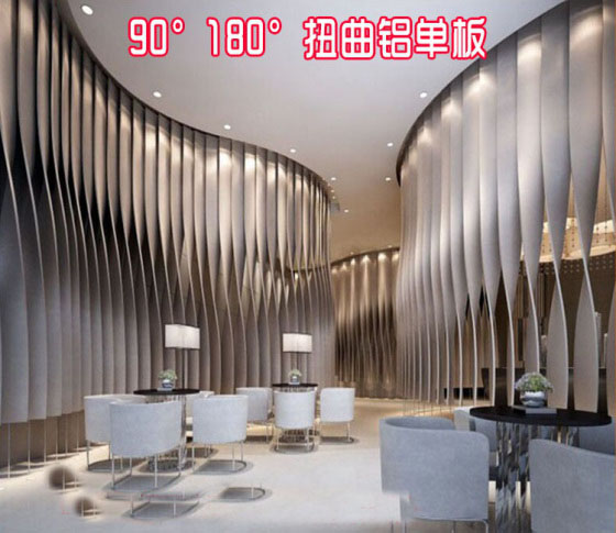 扭曲鋁單板可加工成各種弧形及異形,表面可噴涂成多種顏色,在墻面形成各種美麗的圖案;并且可以和玻璃幕墻等組合成不同的外觀形體,使建筑物更具高貴典雅的風格。