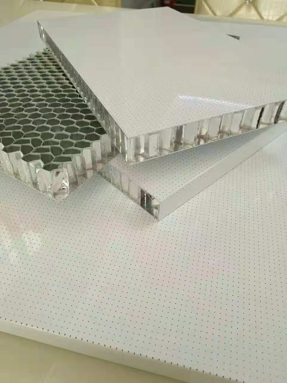 億萊鋁合金蜂窩板的蜂窩結構形成的中空蜂窩單元空間,致使空氣之間不產生對流從而使板塊具有良好的隔熱、保溫、防潮性能;同時由于墻板是中空蜂窩復合體結構,具有良好的隔音功能,板面沖孔后達到很強吸聲效果;
