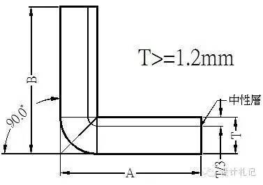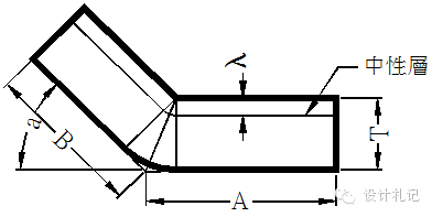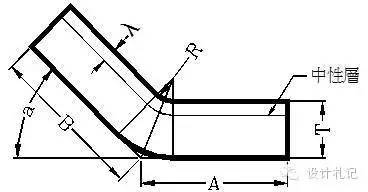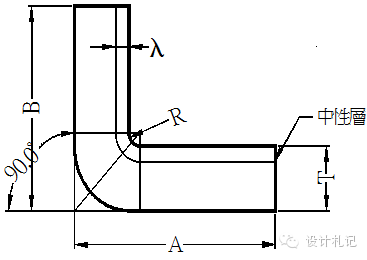 4.3 R≠0 θ=90° L=(A-T-R)+(B-T-R)+(R+λ)*π/2 當R ≧5T時 λ=T/2 1T≦ R <5T λ=T/3 0 < R <T λ=T/4 (實際展開時除使用尺寸計算方法外,也可在確定中性層位置后,通過偏移再實際測量長度的方法.以下相同) |
