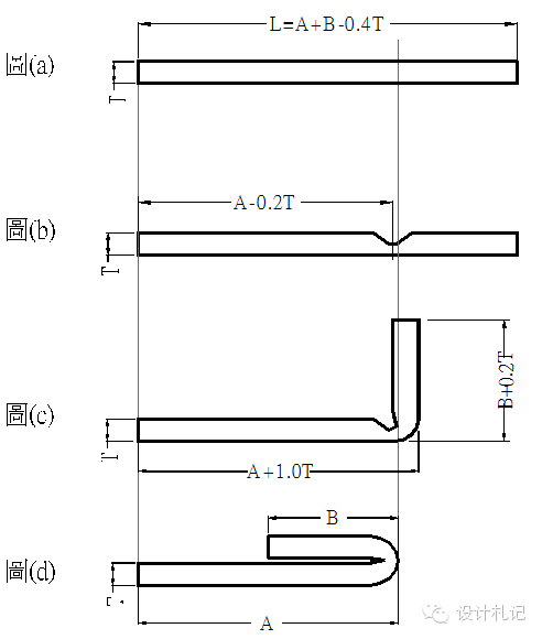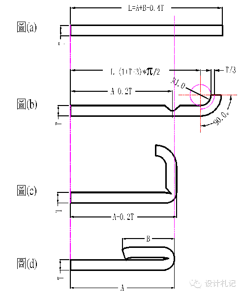 4.13側沖壓平 圖(a): 展開長度 L=A+B-0.4T 圖(b): 壓線位置尺寸 A-0.2T 圖(c): 90°折彎處尺寸為A+1.0T 圖(d): 側沖壓平后的產品形狀 |