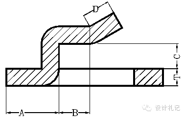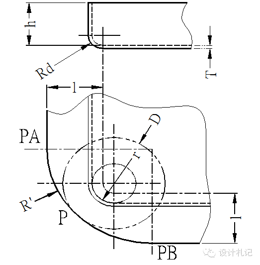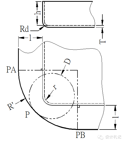 4.11壓縮抽形2 (Rd>1.5T) 原則:直邊部分按彎曲展開,圓角部分按拉伸展開,然后用三點切圓(PA-P-PB)的方式作一段與兩直邊和直徑為D的圓相切的圓弧. 當Rd>1.5T時: l按相應折彎公式計算. D/2={(r+T/3)2 +2(r+T/3)*(h+T/3) -0.86*(Rd-2T/3)*[(r+T/3) +0.16*(Rd-2T/3)]}1/2 |