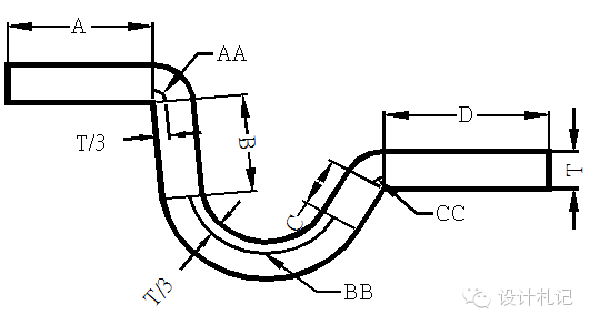 4.14 綜合計算如圖: L=料內+料內+補償量 =A+B+C+D +中性層弧長(AA+BB+CC) (中性層弧長均按 “中性層到板料內側距離λ=T/3”來計算) |
