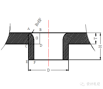 4.8 抽芽 抽芽孔尺寸計算原理為體積不變原理,即抽孔前后材料體積不變;ABCD四邊形面積=GFEA所圍成的面積. 一般抽孔高度不深取H=3P(P為螺紋距離),R=EF見圖 ∵ T*AB=(H -EF)*EF+π*(EF)2/4 ∴ AB={H*EF+(π/4-1)*EF2}/T ∴預沖孔孔徑=D – 2AB T≧0.8時,取EF=60%T. 在料厚T<0.8時,EF的取值請示上級. |