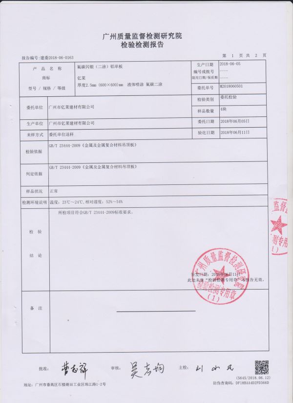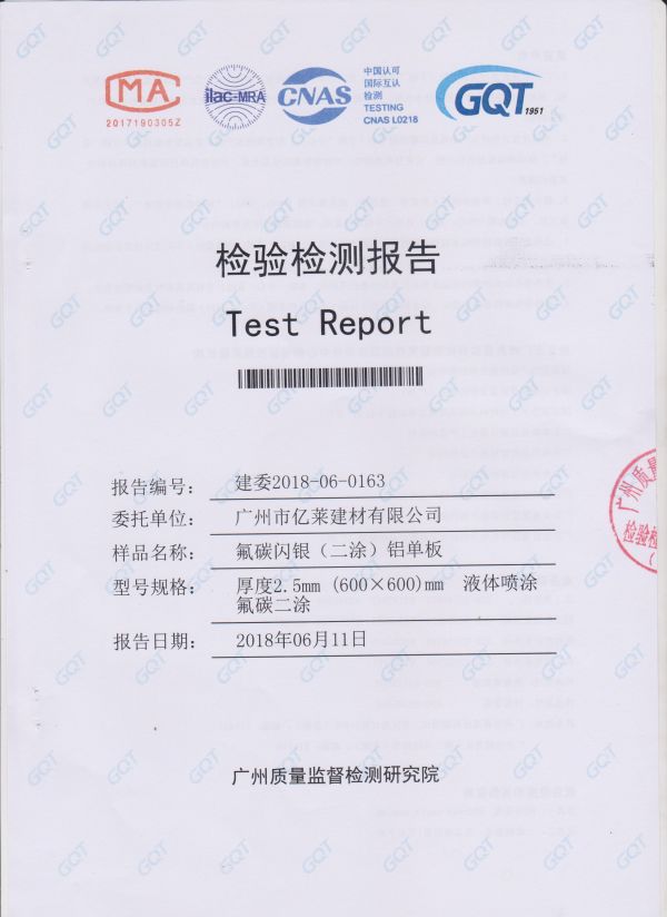 氟碳閃銀鋁單板檢測報告